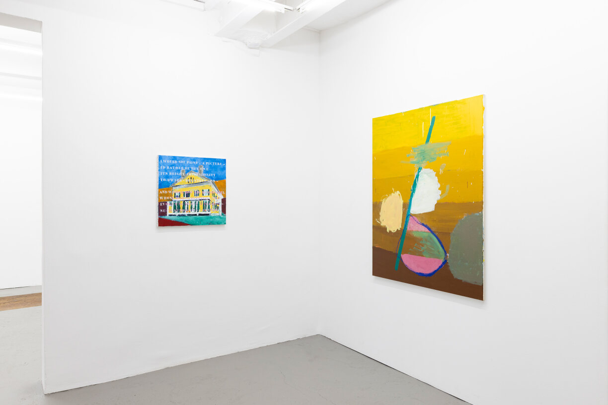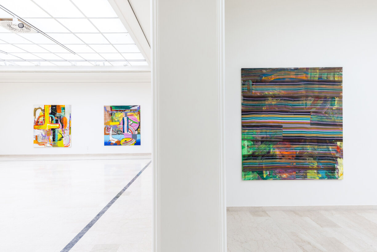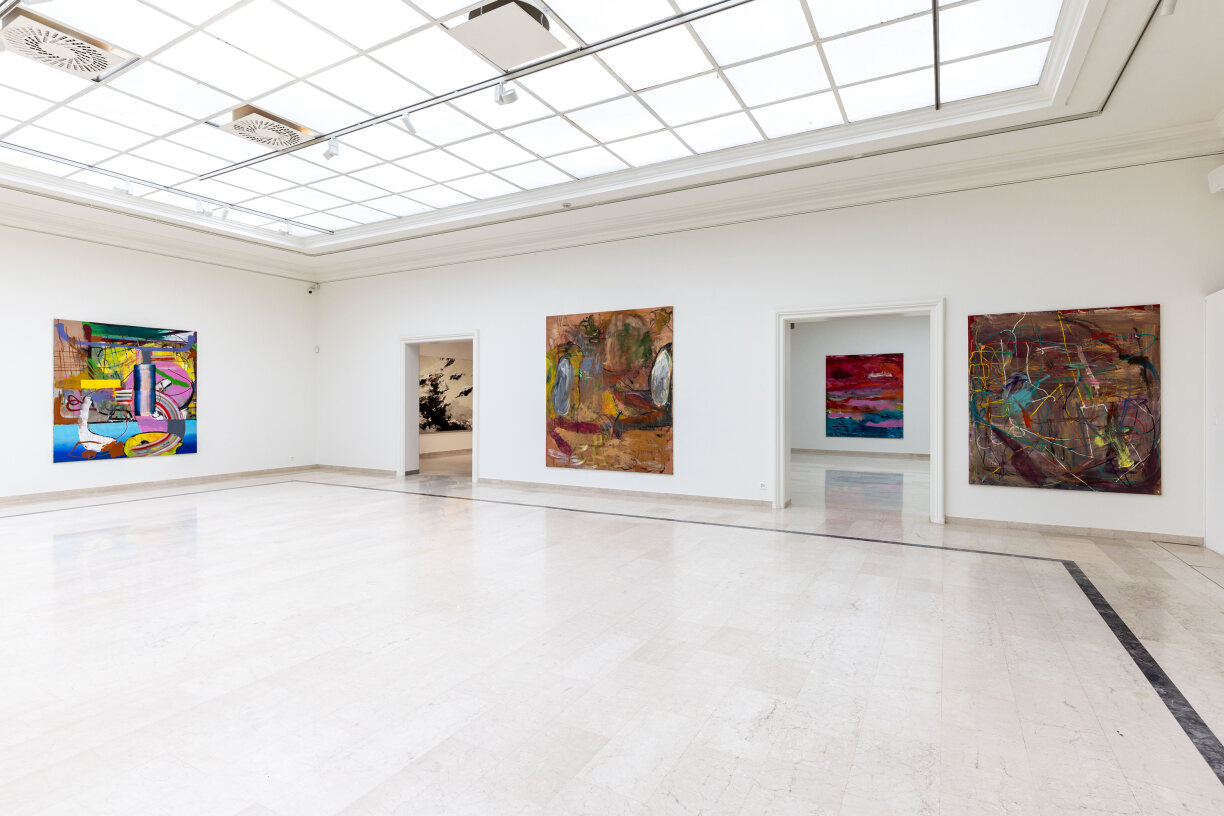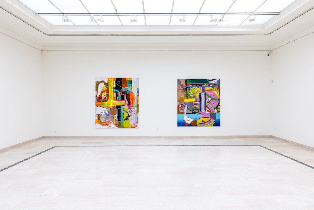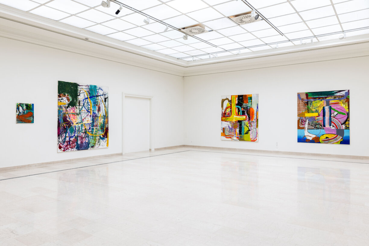 So etwa beim titelgebenden ‹The Yellow Suit›, 2021. Zu sehen sind aber auch reduzierte, geradezu ruhige Gemälde, die zum Innehalten einladen. So etwa ‹Planets), 2021, eine durch Linien verbundene Konstellation farbiger runder Flächen, die auf einem grauen Farbverlauf schwebt.